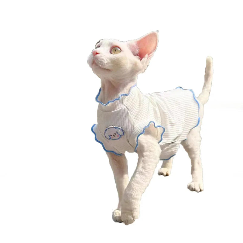 Ajoute une touche de douceur et de style à la garde-robe de ton chat avec ce t-shirt blanc en coton ultra-confortable ! Ce modèle se distingue par ses détails volantés aux manches, au col et au bas du t-shirt, tous rehaussés d’un délicat liseré rouge pour un look élégant et original. Un adorable logo bonbon est brodé sur la poitrine, apportant une note sucrée. Parfait pour les félins qui aiment faire les vedettes.